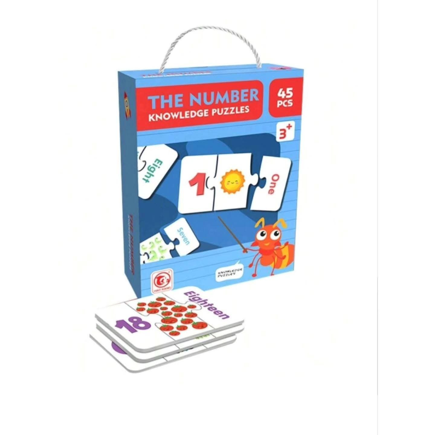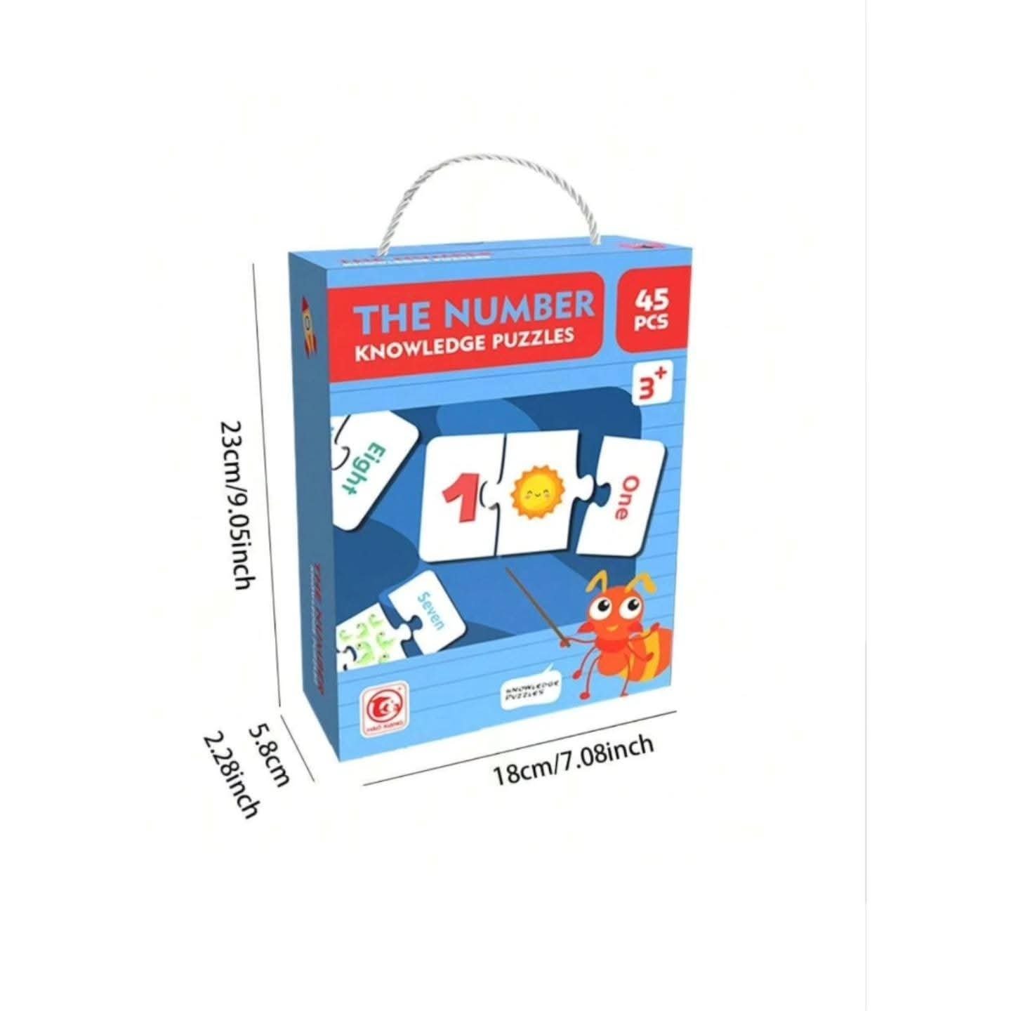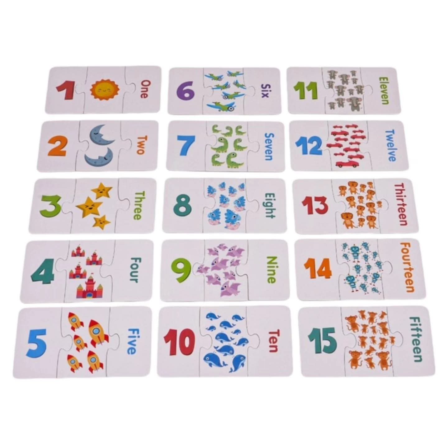 The set includes 45 durable puzzle pieces that kids can easily pick, match, and connect. Each puzzle has a number, its written form, and matching objects, making it a complete learning tool for both numbers and counting.
